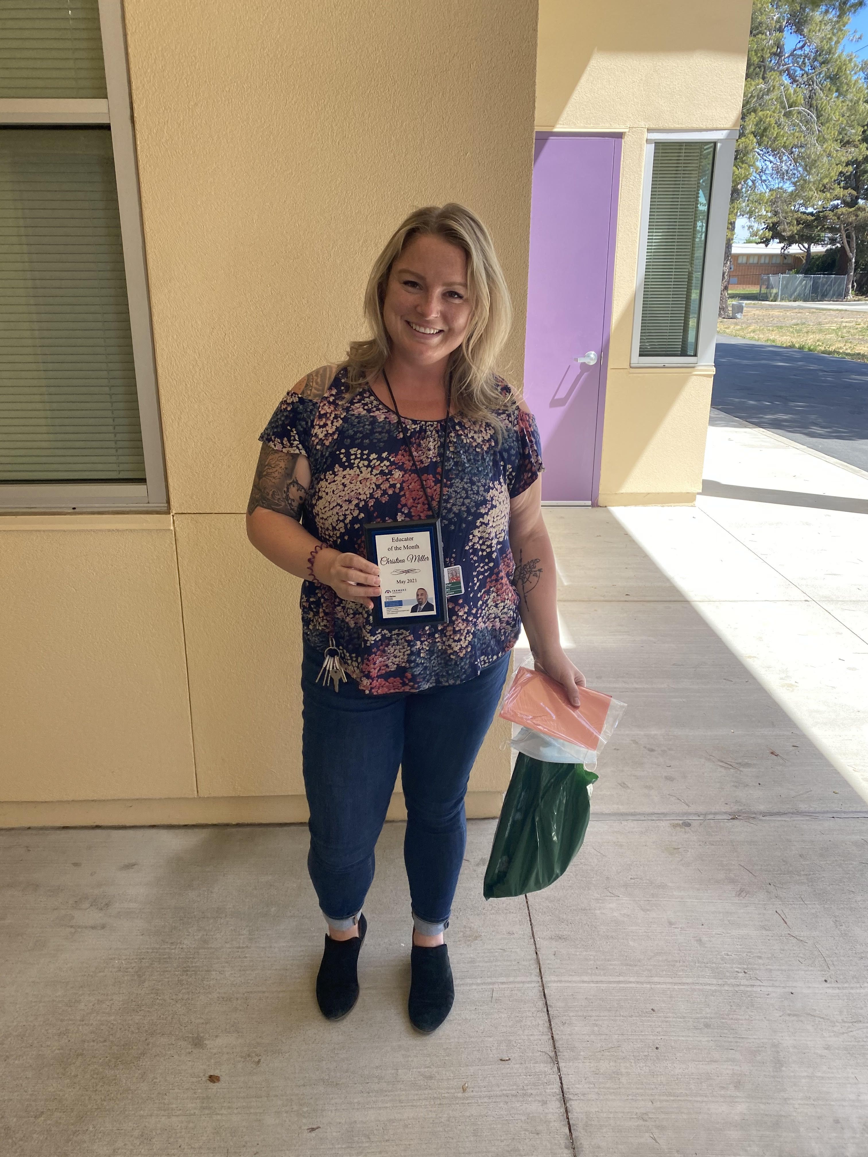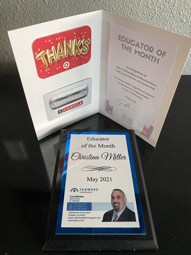 I would like to take this time to congratulate Christina Miller for winning Educator of the month for May 2021. She was nominated by Erika English for her hard work and dedication to help today’s youth succeed in life. She is finishing up her fifth year as a School Psychologist. The last four years She was in the Vallejo City Unified School District, and this is her first year in Fairfield-Suisun Unified, which She thinks is cool because this is the district she grew up in. Giving back full circle.